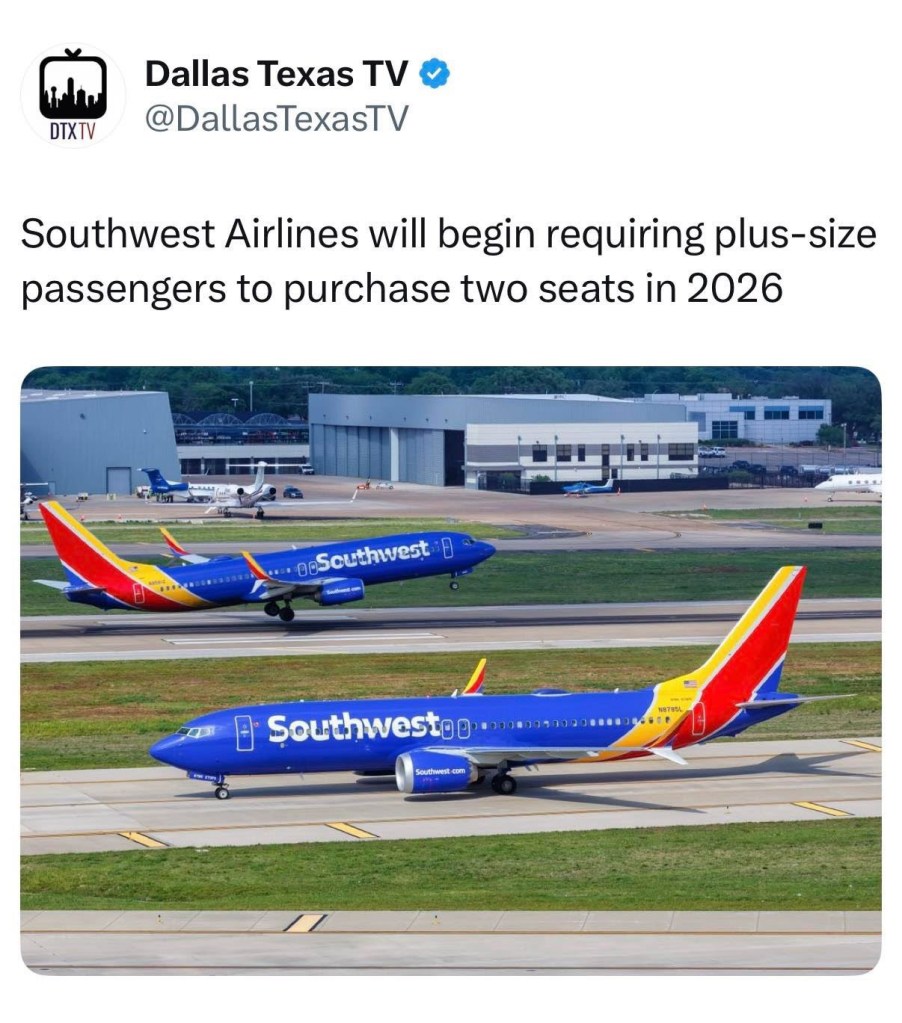 Southwest Airlines just announced: plus-size passengers will be required to buy two seats.